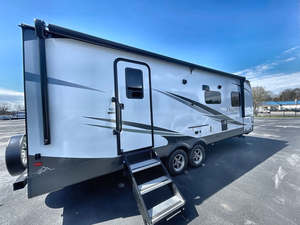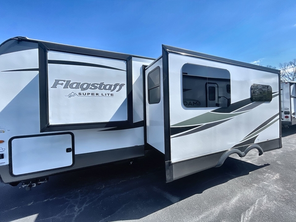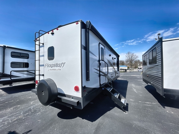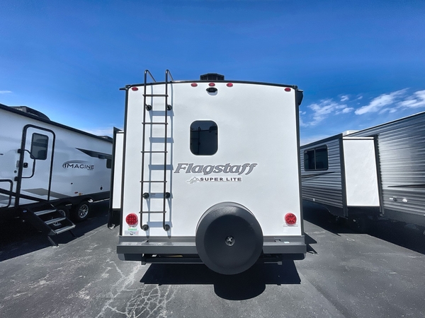 With any Flagstaff Super Lite travel trailer by Forest River the towing features include the TST tire pressure monitor system with a monitor providing safety on the road, Easy Lube axles and Nev-R adjust brakes, a power tongue jack for easy setup, and rear observation camera prep. Each is built with 6 sided aluminum framed side walls, end wall, front, floor and a roof, a plywood tongue and groove subfloor, electronically controlled heated holding tanks and an enclosed underbelly allowing you to travel during any season. The interior offers a multi-zone stereo with DVD, CD, AM/FM and Bluetooth control, a Showermiser water saving system, designer bedding and so much more!