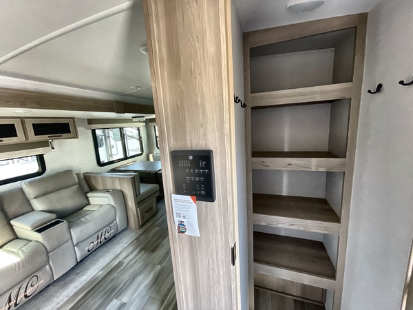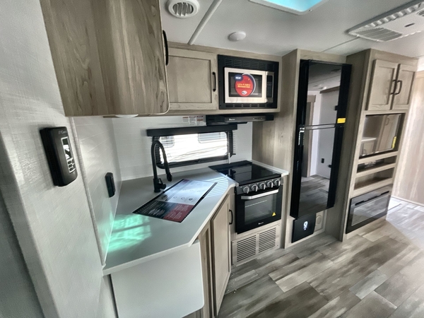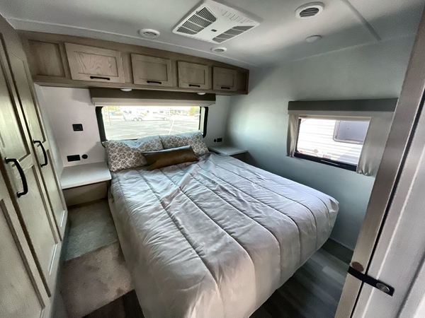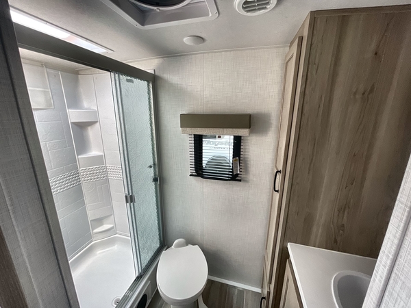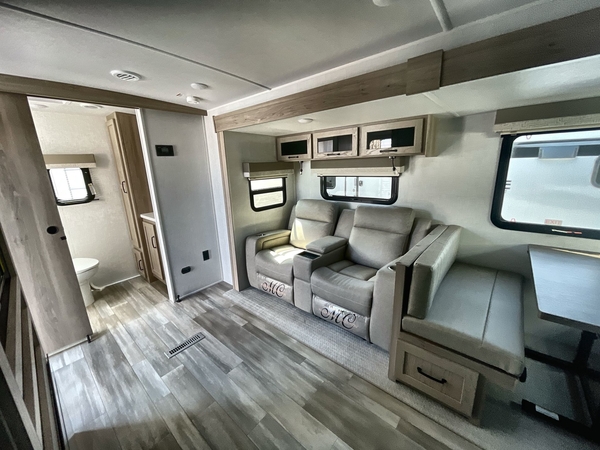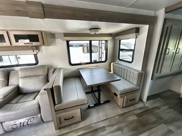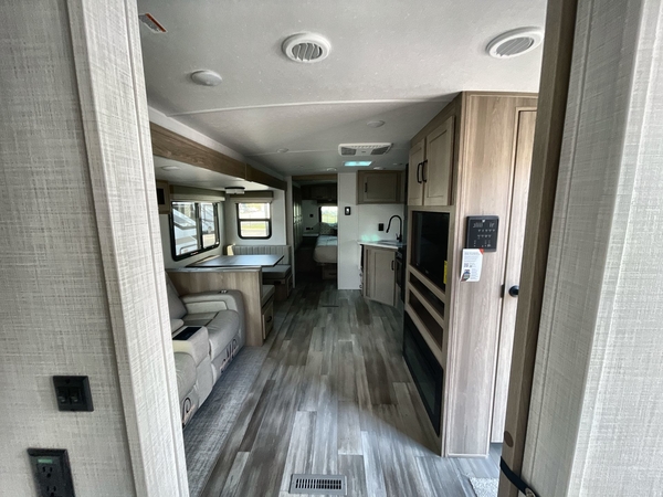 Whether you camp at state parks, National forests or on your friend's land, this trailer offers you plenty of floor space thanks to the two slide outs! As you enter the main entrance near the rear kitchen you can grab a drink from the 12V refrigerator or a snack from the pantry and relax on the 60" theater seating or sit at the booth dinette. The Smart TV offers entertainment while the fireplace will keep you cozy during the cooler months. Everyone will appreciate having a full bathroom to get cleaned up in, and the front bedroom gives you privacy and a queen bed slide, plus storage and the second exterior entry.