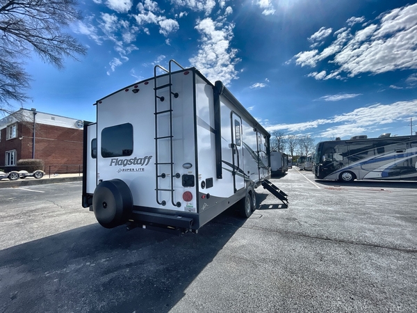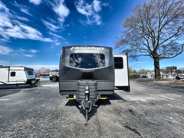With any Flagstaff Super Lite travel trailer by Forest River the towing features include the TST tire pressure monitor system with a monitor providing safety on the road, Easy Lube axles and Nev-R adjust brakes, a power tongue jack for easy setup, and rear observation camera prep. Each is built with 6 sided aluminum framed side walls, end wall, front, floor and a roof, a plywood tongue and groove subfloor, electronically controlled heated holding tanks and an enclosed underbelly allowing you to travel during any season. The interior offers a multi-zone stereo with DVD, CD, AM/FM and Bluetooth control, a Showermiser water saving system, designer bedding and so much more!