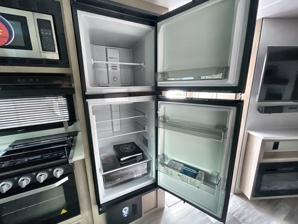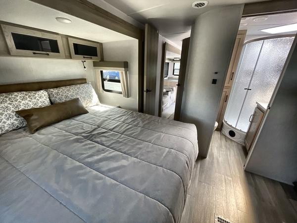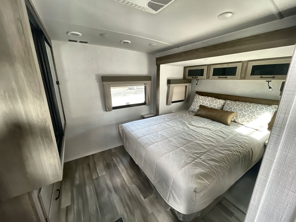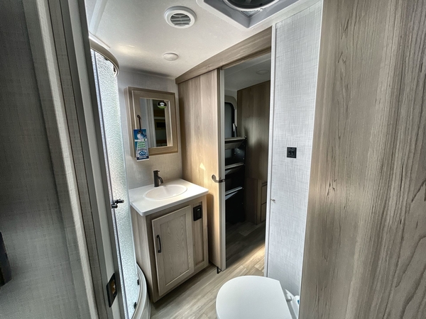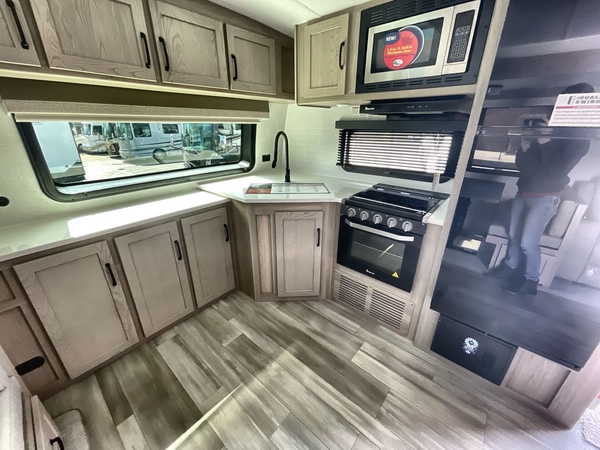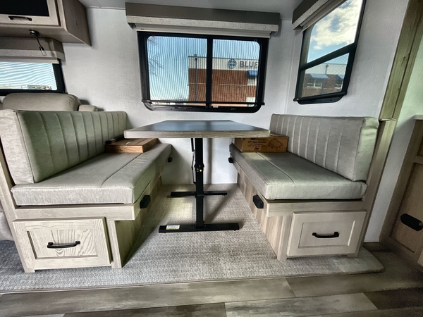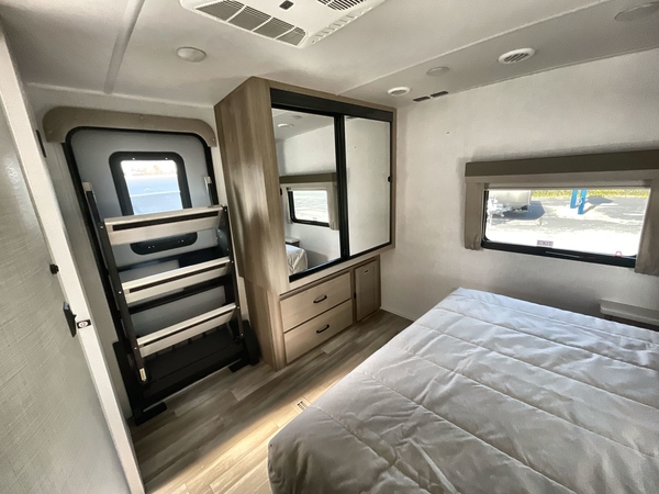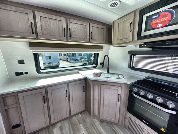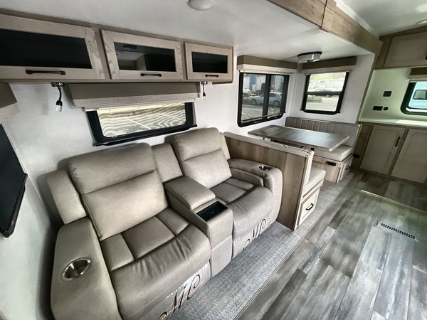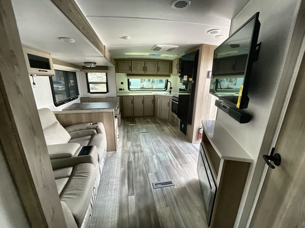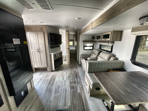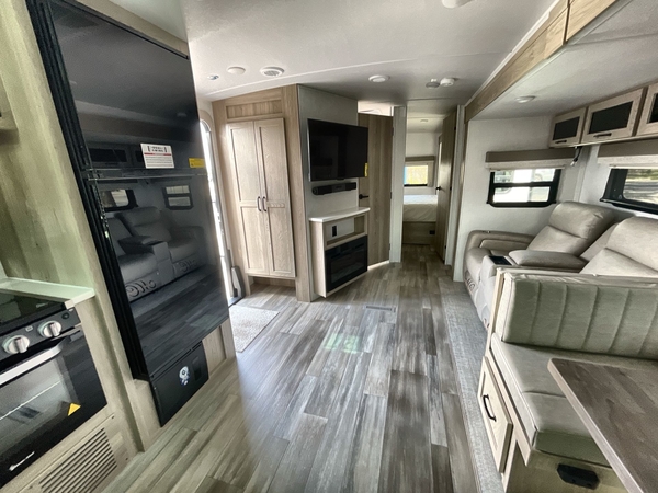This is the perfect couples trailer with a spacious living and kitchen area and a rear bedroom which includes the second exterior entry/exit door! The bedroom also provides a slide out queen bed, a wardrobe and an optional TV, plus windows for great views and access to the double entry bathroom. The front kitchen gives the cook counter space and cabinetry for dishes and such, plus all the appliances needed to make warm meals and store leftovers. You can dine at the booth dinette, relax on the 67" theater seating and watch the Smart TV while enjoying the fireplace.