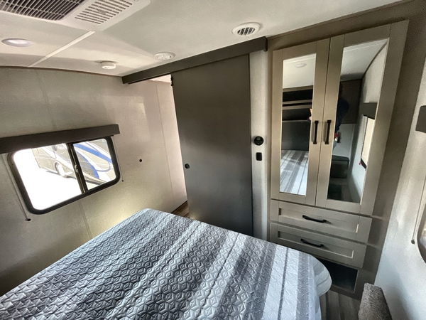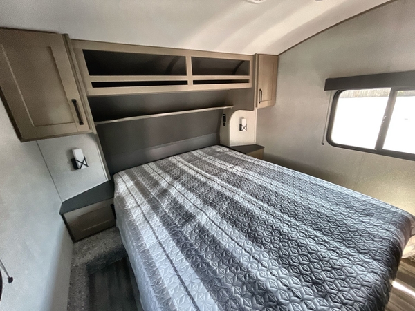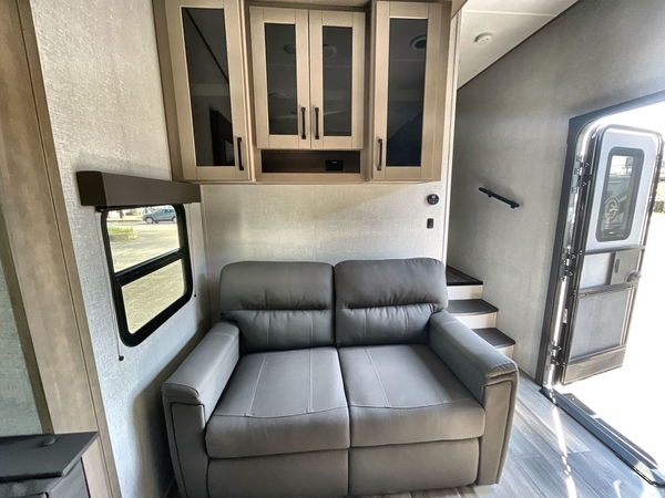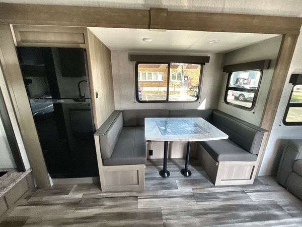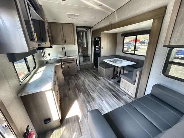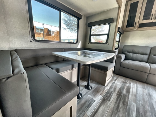 Camping with friends and family just got a whole lot easier in this fifth wheel with double-size bunks and a front private bedroom. Your guests will also have a wardrobe and step storage to keep their things tidy, and the bedroom closet will be perfect for your things. If you have other guests stay over, they can sleep on the U-shaped dinette within the slide out or the tri-fold sofa, and there is a 40" high-definition LED TV here to keep everyone entertained on rainy days. Everyone can take turns cleaning up in the full bath that includes a residential walk-in shower, a power vent fan, plus a large vanity top with a deep sink. And you will feel right at home in the front private bedroom with its queen bed, overhead cabinets, and TV prep if you'd like to add a television!