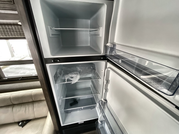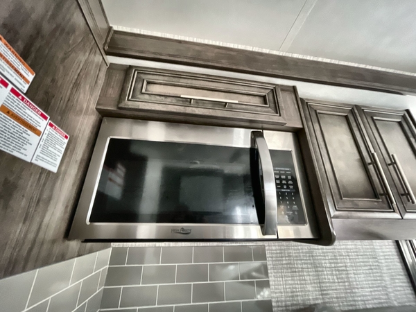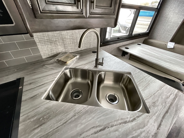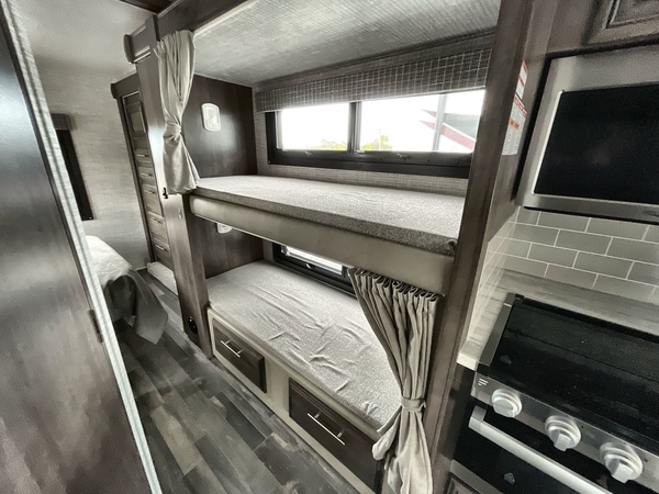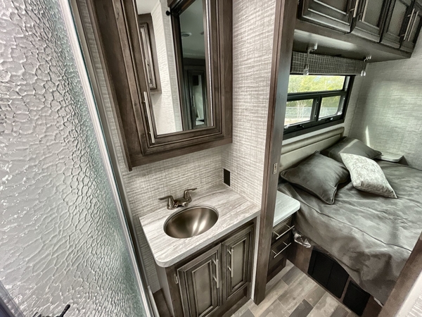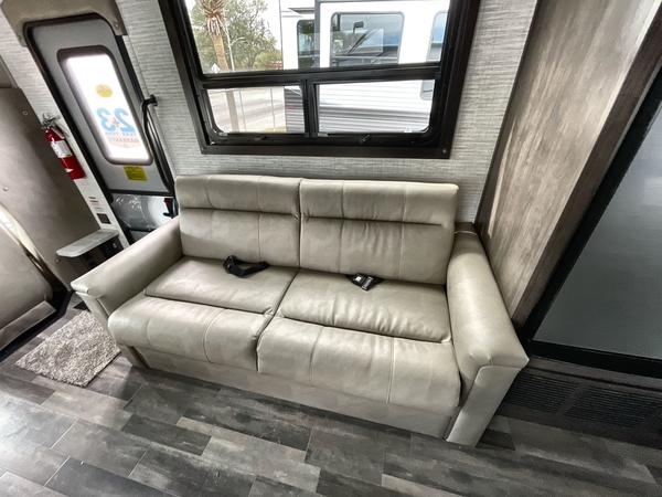 Searching for an RV to travel with family and friends? This coach offers up to seven sleeping spaces when you utilize the queen bed, the bunk beds, the cab over bunk and the furniture. The private master bedroom is in the rear and has access to the double entry bathroom, and the bunk beds are just across from the main entrance which is convenient. The kitchen provides a Furrion all-in-one cooktop and oven, a residential-size microwave and an 10 cu. ft. refrigerator, plus a pantry. You can dine at the Jayco exclusive, easy-operation legless dinette table or while sitting on the sofa. You might like to add the theater seating option in place of the sofa if you prefer that setup. And the cab seats swivel for more seating.