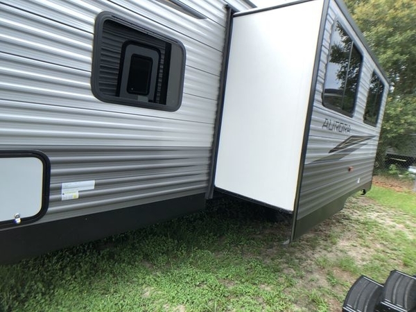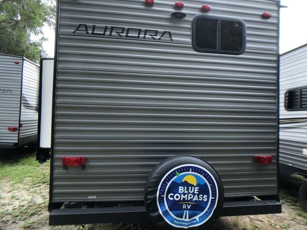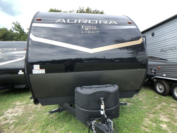 Comfortability, usability, and quality is what you will find in each one of these Forest River Aurora travel trailers, toy haulers or destination trailers! They are designed with a superior build and packed full with industry leading, functional, and distinctive standard features. SolidStep entrance steps and a Safe-T rail door assist on main entry door to help you safely enter and exit the unit. The diamond plate rock guard will protect your unit from road debris and the nitrogen filled radial tires, which keep their pressure longer, offer better fuel economy. You will also find upgraded JBL Elite exterior speakers outside, an electric awning with multicolor lights and remote, plus flush mount baggage doors for easy packing. The interiors are beautifully designed with a deep undermount farm style sink, stainless steel appliances, and linoleum flooring throughout which will be easy to clean. Come find your favorite model today!