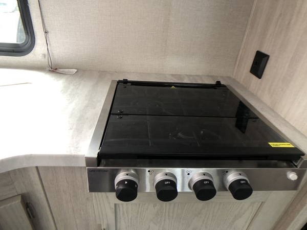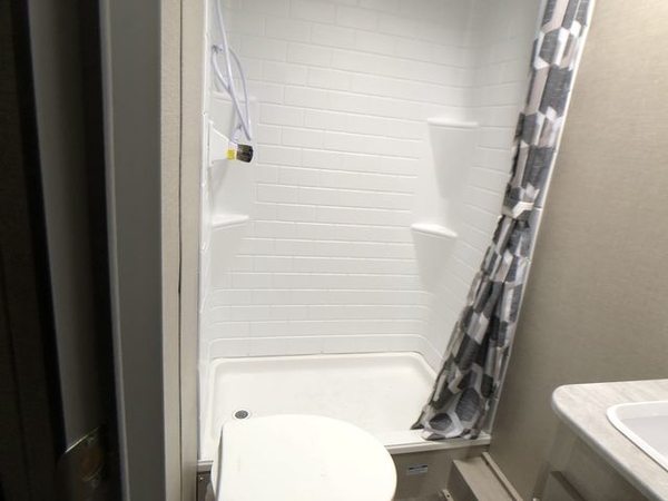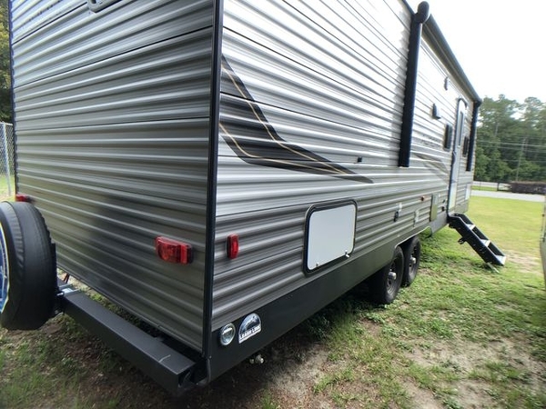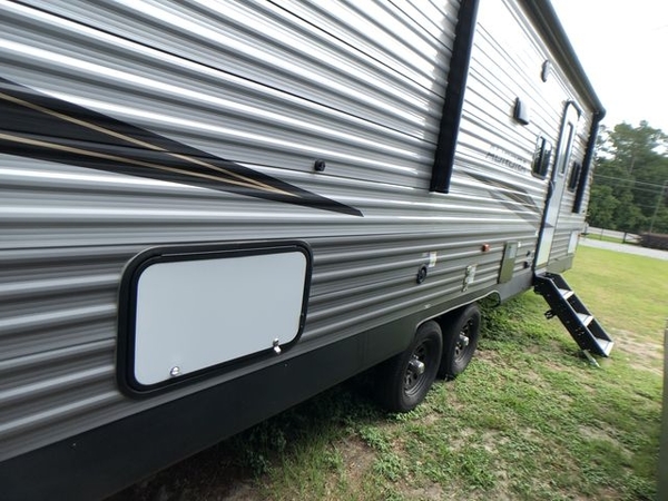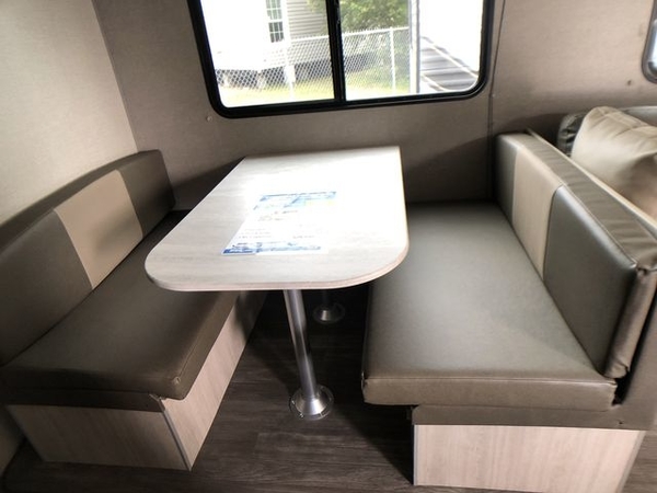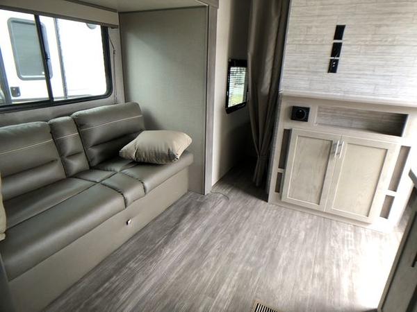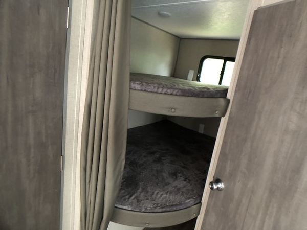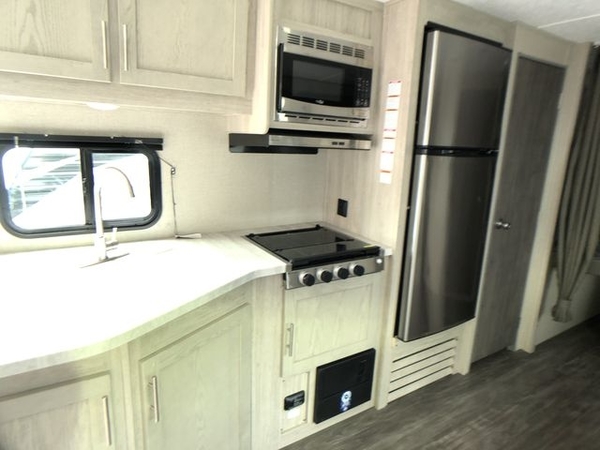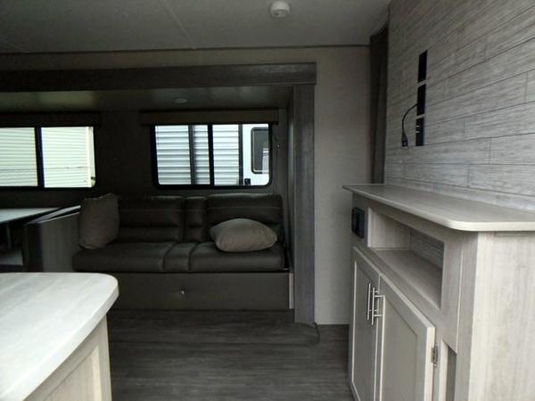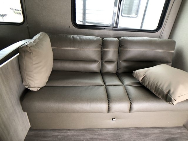 Everyone will have a comfortable time camping in this travel trailer! It features a set of double sized bunk beds for the kids or guests to sleep on and are conveniently next to the rear corner bathroom which has a tub/shower with a skylight above for added natural lighting. The booth dinette and sofa slide opens up the kitchen area so you have more space to prepare your best meals with the three burner cooktop. When you're ready to wind down your nights, grab a snack from the large pantry, a beverage from the 10.7 cu. ft. refrigerator, and place your drink in the cupholder/arm rest of the sofa while you watch a movie at the entertainment center!