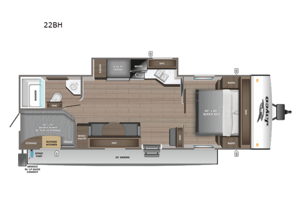 Whether you camp with your family or group of friends, there will be plenty of space to walk around with the slide out kitchen amenities, and to sleep with space for seven! The cook will have a pantry and an 12V refrigerator to store lots of ingredients and cold items. There is a dinette if you want to eat inside, plus a full bathroom in the rear corner to keep everyone clean. You can enjoy privacy in the front bedroom with a queen bed, and the double-size bunks sleeps four. The cook will love the choice of making meals using the outside kitchen, and the 20' power awning offers an outdoor living area with protection.