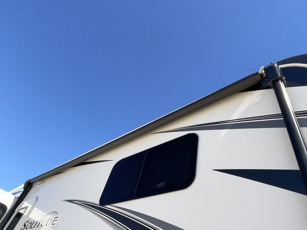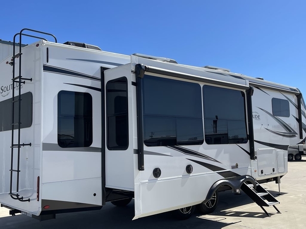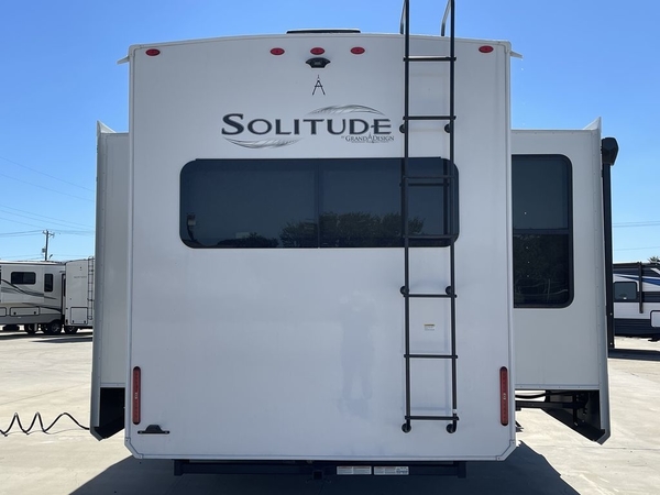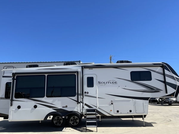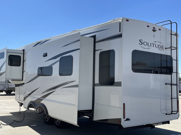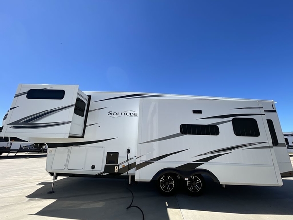 Each Solitude fifth wheel by Grand Design features a 101" wide-body construction, heavy duty 7,000 lb. axles, frameless tinted windows, and high-gloss gel coat sidewalls. You can camp year around thanks to the Weather-Tek Package that includes a 35K BTU high-capacity furnace, an all-in-one enclosed and heated utility center, and a fully enclosed underbelly with heated tanks and storage. Inside, you'll love the premium roller shades, hardwood cabinet doors, solid surface countertops and sinks, plus residential finishes throughout to make you truly feel at home. Each model also includes a MORryde CRE3000 suspension system, self adjusting brakes, and a MORryde pin box that will provide smooth towing from home to campground. Affordable luxury is possible with the Solitude fifth wheels; choose yours today!