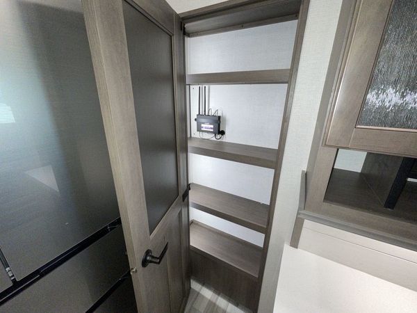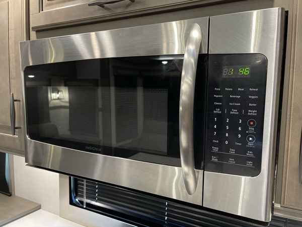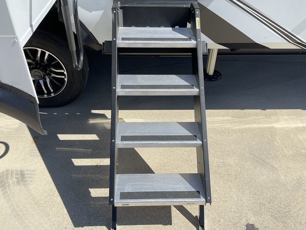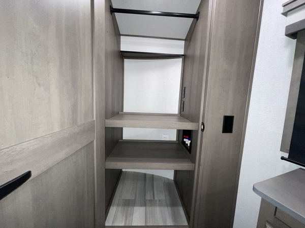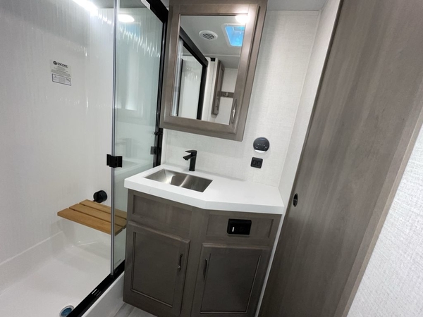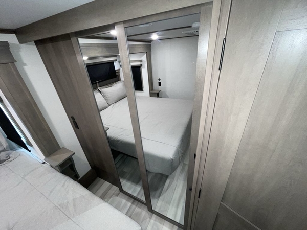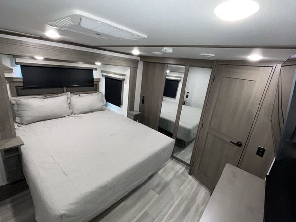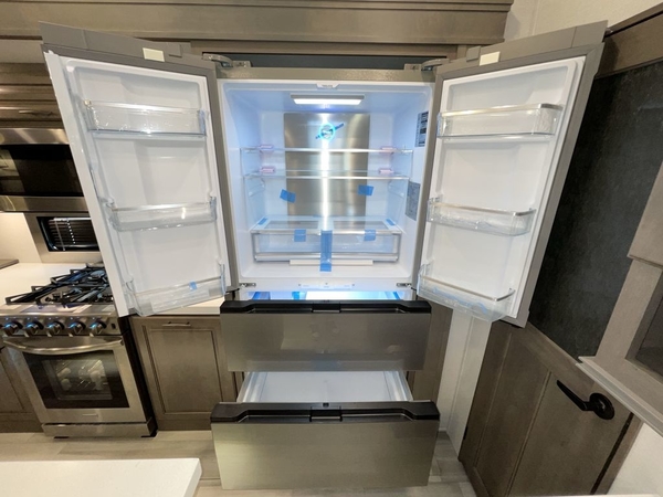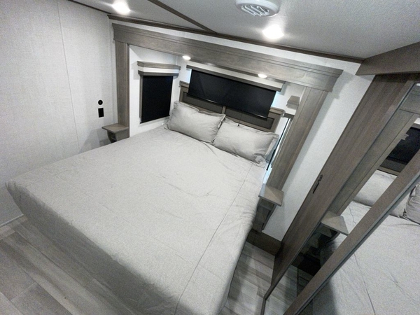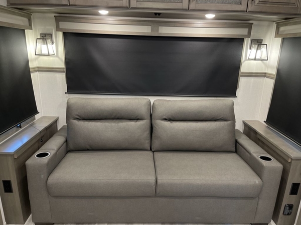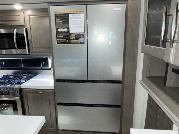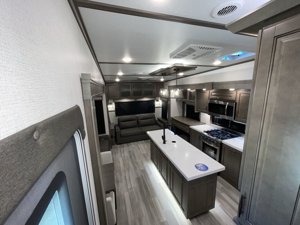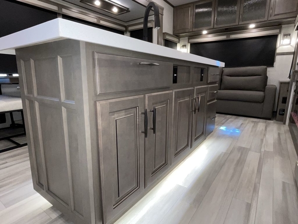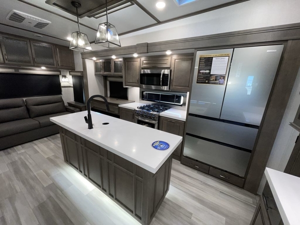 Traveling for long periods at a time is made easy with this gourmet kitchen that can feed your entire group a holiday meal! The professional-grade stainless steel cooktop with a built-in 24" residential oven, microwave, 12V 20 cu. ft. refrigerator, and a kitchen island offers everything you will need to enjoy cooking for your family and guests. There is abundant storage throughout multiple overhead cabinets, a kitchen pantry and hutch, shoe storage under the interior steps, a bath linen cabinet for your towels, and in the front master bedroom which features a large closet. In the bedroom there is also a queen bed on a slide for added space to sleep comfortable at night, or you may choose an optional king bed if you enjoy more space. You will also find a closet with washer/dryer prep, large wardrobe, plus a flip-top dresser with an LED TV above. In the bathroom, enjoy a hot shower with a flip-up teak seat and overhead skylight, plus a vanity with sink. Two nice awnings will provide outdoor living space keeping you protected from the sun and rain, and you can add an optional pull-out kitchen to enjoy convenient cooking outdoors as well.