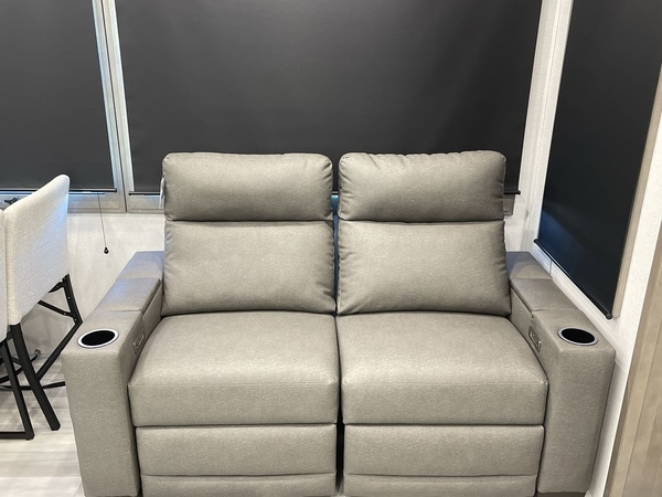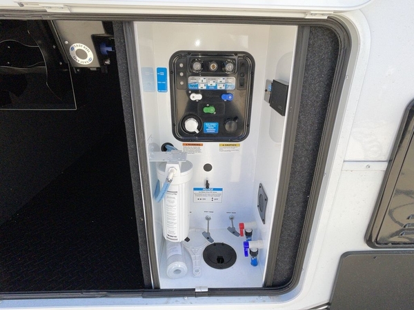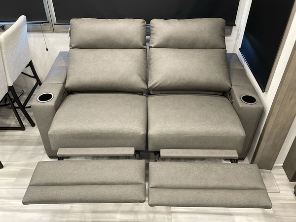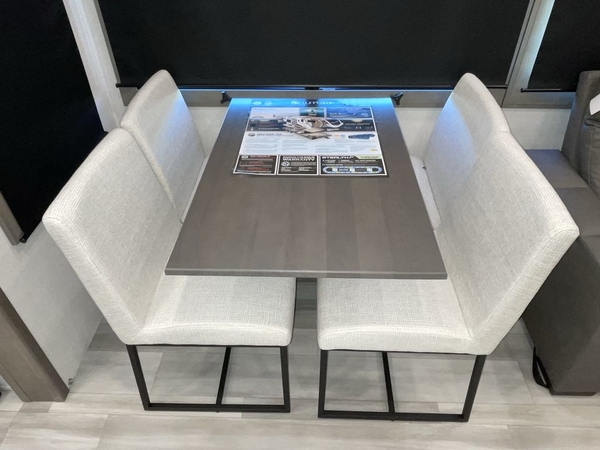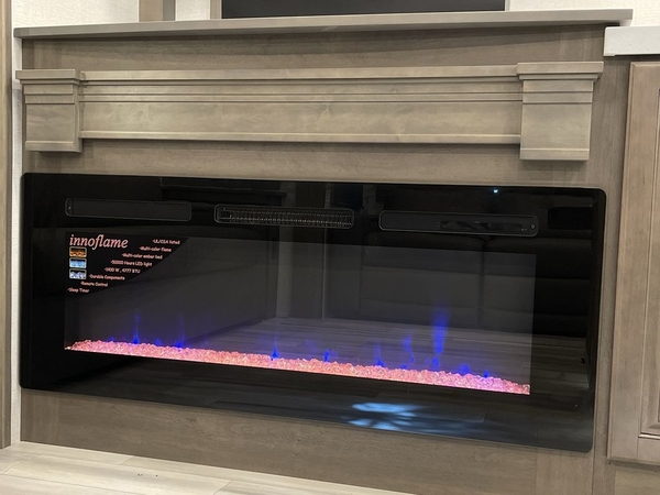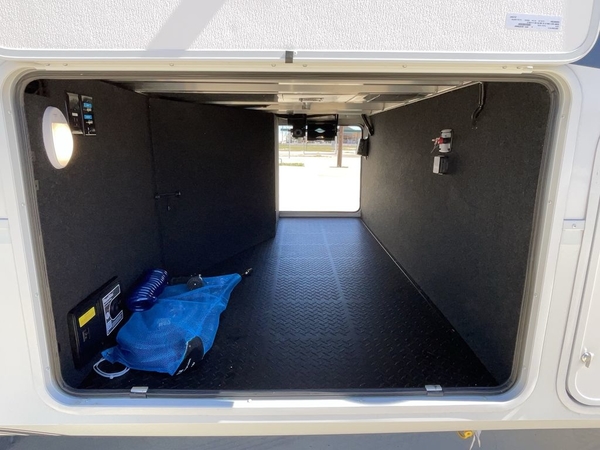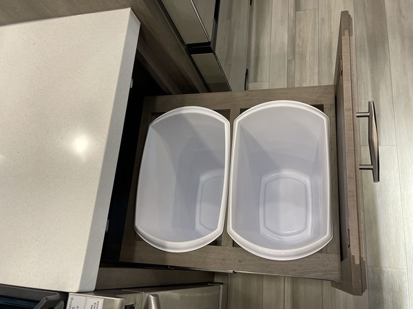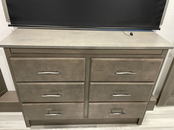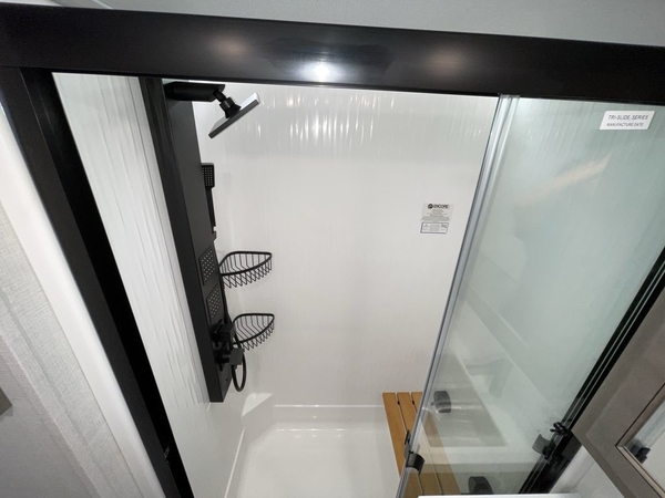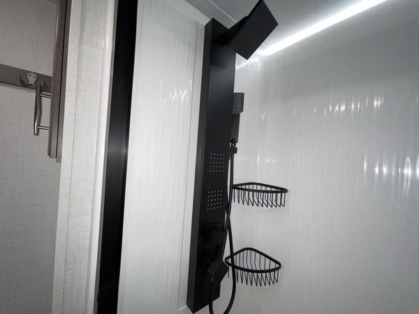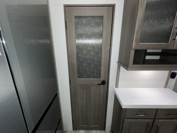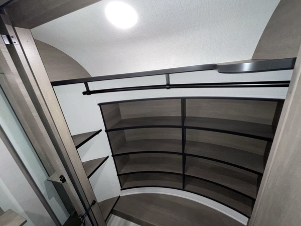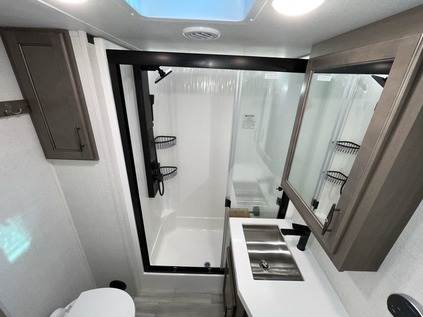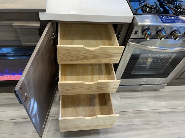Traveling for long periods at a time is made easy with this gourmet kitchen that can feed your entire group a holiday meal! The professional-grade stainless steel cooktop with a built-in 24" residential oven, microwave, 12V 20 cu. ft. refrigerator, and a kitchen island offers everything you will need to enjoy cooking for your family and guests. There is abundant storage throughout multiple overhead cabinets, a kitchen pantry and hutch, shoe storage under the interior steps, a bath linen cabinet for your towels, and in the front master bedroom which features a large closet. In the bedroom there is also a queen bed on a slide for added space to sleep comfortable at night, or you may choose an optional king bed if you enjoy more space. You will also find a closet with washer/dryer prep, large wardrobe, plus a flip-top dresser with an LED TV above. In the bathroom, enjoy a hot shower with a flip-up teak seat and overhead skylight, plus a vanity with sink. Two nice awnings will provide outdoor living space keeping you protected from the sun and rain, and you can add an optional pull-out kitchen to enjoy convenient cooking outdoors as well.