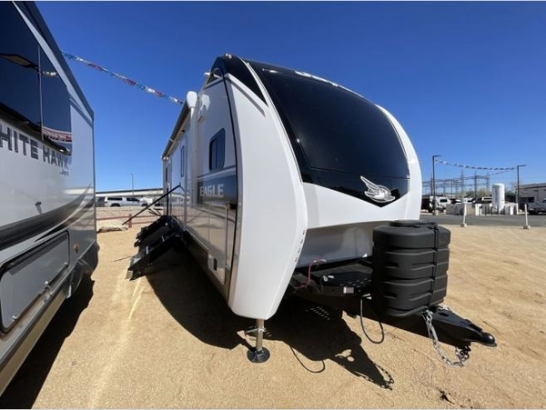 With any Eagle fifth wheel or travel trailer by Jayco you will appreciate durable construction materials, like the Magnum Truss Roof and the Stronghold VBL laminated walls. The JAYCOMMAND Smart RV system puts you in control of your RV's functions, and the 5 Star Handling Package will provide smooth towing from home to camp. Each model features Climate Shield zero-degree tested weather protection and the industry-exclusive HELIX cooling system that will keep you comfortable year around. Some of the exterior conveniences you are sure to love are the pass-through storage with Slam-Latch baggage doors and an automotive style front cap with max turn radius. The Eagle fifth wheels and travel trailers are designed to make you feel at home with solid hardwood slide fascia, residential vinyl flooring, a bathroom skylight, and plenty of storage for all your belongings.