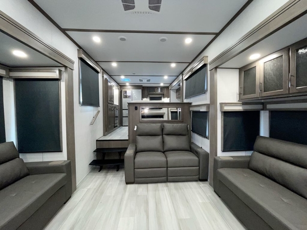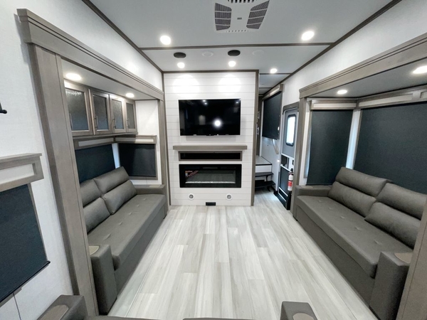 Enjoy each and every vacation, month-long trips, or even extended stays at an RV park in this spacious fifth wheel! The raised rear kitchen gives the cook plenty of room to whip up any type of meal using the stainless steel appliances including a 24" residential oven, an oversized pantry, and the raised bar top will provide you even more counter space on top of dining with two chairs that overlook the middle living area. Relaxing is made easy thanks to two tri-fold sofas and theatre seating while watching the big game on the LED Smart TV and enjoying the fireplace below. Dual sinks in the full bathroom allow two people to easily get ready at once, and the flip up teak seat in the shower is a nice convenience. At night, retire to your own queen bed which slides out to provide more floor space, and enjoy a show on the LED TV above the flip-top dresser once in bed.