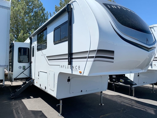 Any Grand Design Influence fifth wheel features five-sided aluminum cage construction with a walk-on roof and a fully enclosed underbelly with heated tanks and storage for all weather camping. For peace of mind, the MORryde CRE3000 Suspension system and ABS braking system will provide safe and smooth towing, and the 101" widebody construction offers all the room you need and that is before multiple slides are fully engaged. You will appreciate the keyed alike locks, slam-latch baggage doors with magnetic door catches, exterior security light, and solid surface entry steps. On the inside, Congoleum flooring, premium roller shades for privacy, a hallway handrail for safety, and nightstands with USB ports to keep all of your electronics fully charged. You will also love the On Demand tankless water heater when showering, plus the added heat and ambiance from an electric fireplace, and so much more!