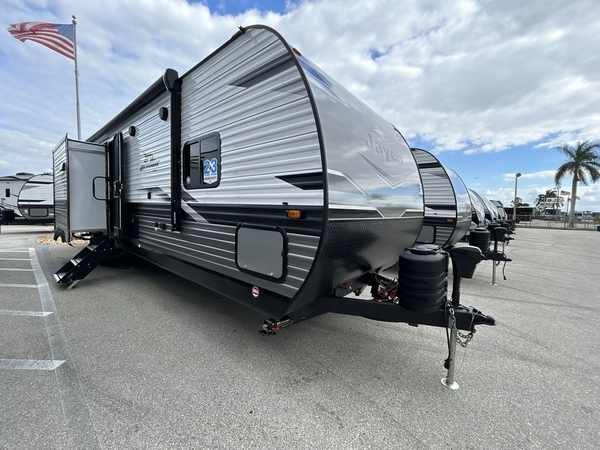 These Jayco Jay Flight travel trailers have been a family favorite for years with their lasting power and superior construction. An integrated A-frame and magnum truss roof system holds them together. When you tow one of these units you're towing the entire unit and not just the frame. With dark tinted windows, you have more privacy and safety. The vinyl flooring throughout will be easy to clean and maintain too. Come find your favorite model today!
