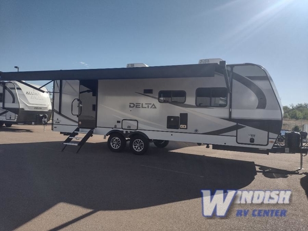 You will love all of your adventures with this Delta travel trailer in tow! This unit is perfect for a couple or even a family of four or six with a queen bed in the front private bedroom, and also using the sofa and U-shaped dinette once converted for more sleeping space. The U-shaped dinette is great for gathering for meals, a board game or game of cards, and the sofa is directly opposite a 40" HDTV which makes viewing enjoyable. You can easily prepare all of your favorite meals and snacks with the kitchen amenities provided inside. A three burner range allows you to easily cook indoors, or you can cook outside using the outdoor griddle/grill if you like. There is a 10 cu. ft. 12V refrigerator to keep all of your perishables and drinks nice and cold, plus a large sink for dishes and cleaning up, and a convenientpull-out trash can and flip-up counter extension as well. You will also appreciate the full rear bath featuring a 30" x 36" shower, toilet, vanity with sink, and linen cabinet for your towels and toiletries.