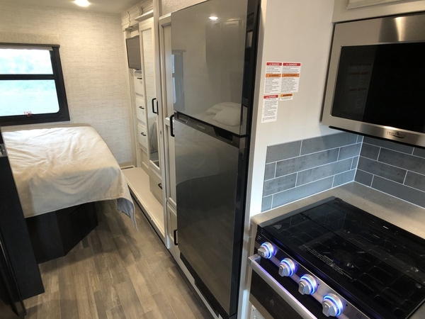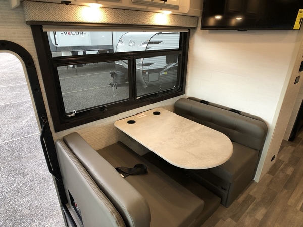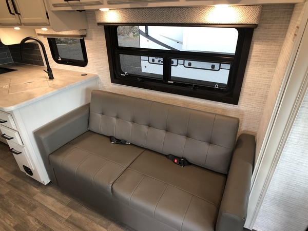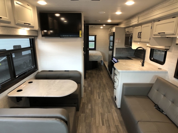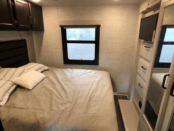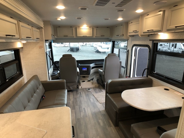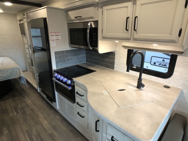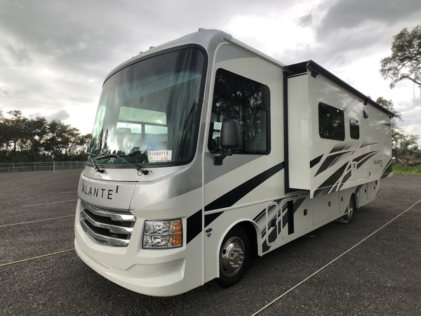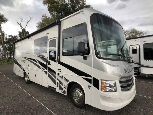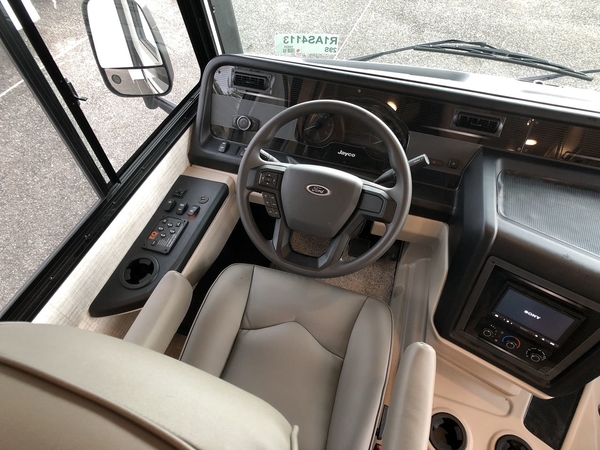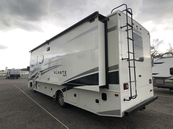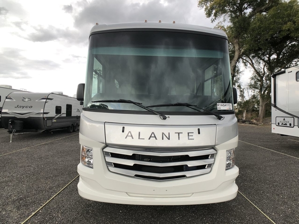 With any Alante Class A gas motorhome by Jayco, the mandatory Customer Value package provides JRide technology with a computer-balanced driveshaft ensuring smooth and efficient power transfer to the wheels, and SACHS shock absorbers offering independent adjustments to the road conditions. There is also a one-piece, seamless, crowned fiberglass roof, and an exterior entertainment center to watch shows and movies. The automatic hydraulic leveling jacks, 120 in. panoramic windshield, 200W solar panel, and the electric-powered entrance step will make traveling that much easier. And the interior equipment includes a Sony infotainment center with Apple CarPlay and Android Auto, a backup and side-view cameras for easy parking, plus a 6-way power driver seat for comfortable and safe driving. You will also love the power front privacy shade with manual side privacy shades, LED-lit hardwood fascia and countertops, a pop-up charging station in the kitchen and a USB port and wireless charging in the nightstands.