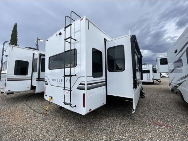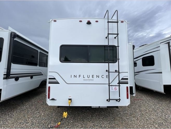Any Grand Design Influence fifth wheel features five-sided aluminum cage construction with a walk-on roof and a fully enclosed underbelly with heated tanks and storage for all weather camping. For peace of mind, the MORryde CRE3000 Suspension system and ABS braking system will provide safe and smooth towing, and the 101" widebody construction offers all the room you need and that is before multiple slides are fully engaged. You will appreciate the keyed alike locks, slam-latch baggage doors with magnetic door catches, exterior security light, and solid surface entry steps. On the inside, Congoleum flooring, premium roller shades for privacy, a hallway handrail for safety, and nightstands with USB ports to keep all of your electronics fully charged. You will also love the On Demand tankless water heater when showering, plus the added heat and ambiance from an electric fireplace, and so much more!