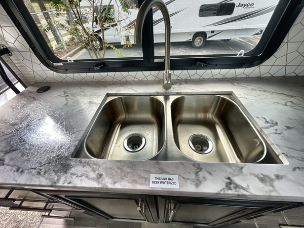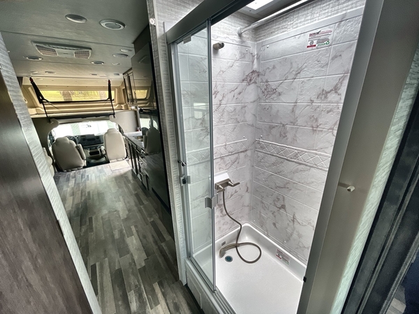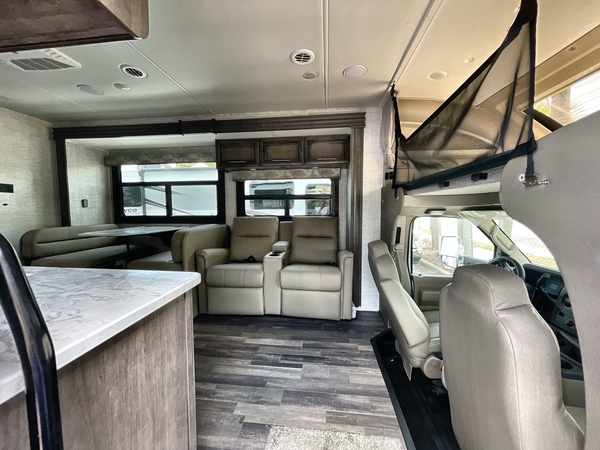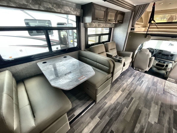 With any Greyhawk Class C gas motorhome by Jayco you will experience smooth sailing thanks to the JRIDE PLUS that comes with Koni shock absorbers, a computer-balanced driveshaft, Hellwig helper springs, and more. The Ford E-450 chassis with a 7.3L V8 325 HP engine will power your excursions, and you'll appreciate the added safety features for your peace of mind. Each model features a Sony infotainment center with Apple CarPlay and Android Auto, backup and side-view cameras, and a tire pressure monitor system the driver is sure to appreciate. Durable construction begins with Stronghold VBL roof, floor and sidewalls, bead-foam insulation, and a one-piece seamless fiberglass front cap. Head inside to find blackout night roller shades, LED-lit pressed countertops, an 84" interior ceiling height, and hardwood cabinet doors and drawers.