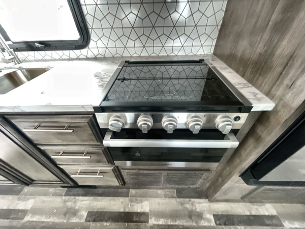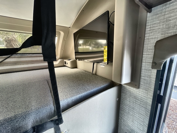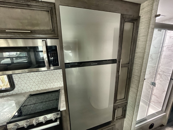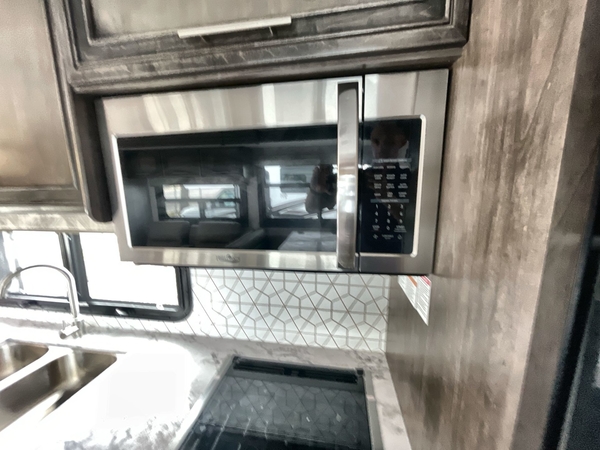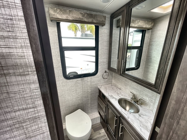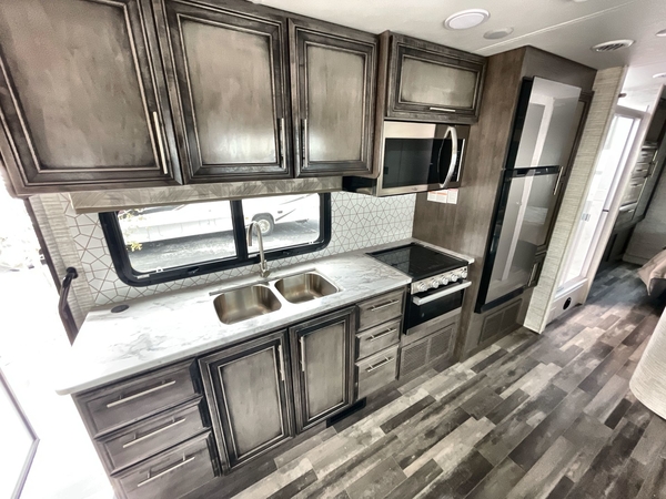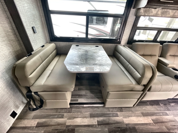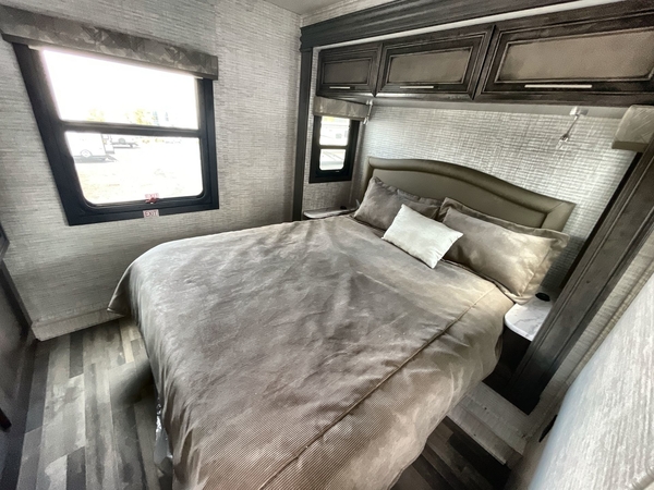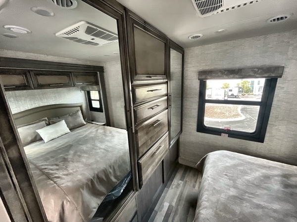 This motorhome includes double slides so you can enjoy more interior space, just like at home! The 42" x 70" booth dinette and 60" tri-fold sofa are in great view of the LED HD Smart TV, and your guests can sleep here, as well as on the cab-over bunk. This Greyhawk kitchen includes a Furrion all-in-one cooktop and oven, a residential-size microwave, and a pantry to store dry goods. You will find a convenient 30" x 36" shower, with the private toilet and sink across the hall so two people can freshen up at once. And don't overlook the rear bedroom with its queen bed slide out, dual bedroom wardrobes, and cabinet!