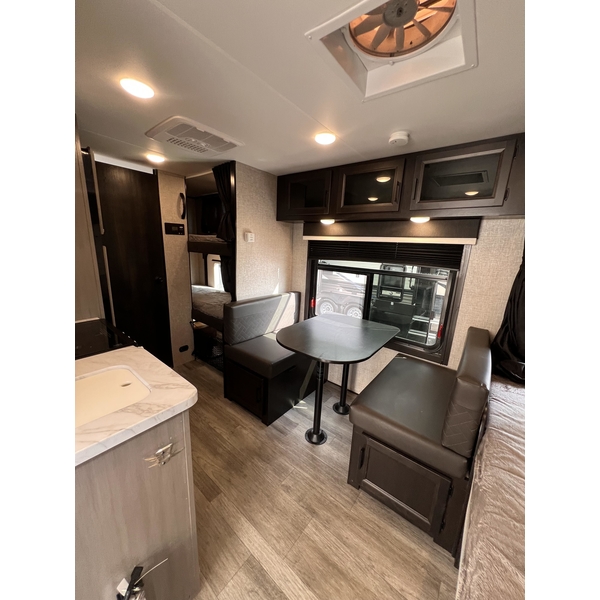 The main living area is thoughtfully designed with a slide-out that expands the space, creating a comfortable dining and lounging area. The dinette can also convert into additional sleeping space if needed. The kitchen is efficiently equipped with modern appliances, including a refrigerator, stove, and microwave, along with ample counter space and storage for preparing meals on the go.