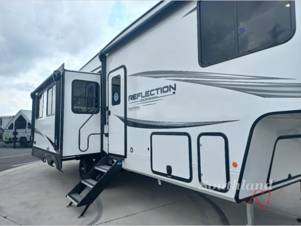 With any Reflection 150 Series fifth wheel by Grand Design, there is more available payload capacity and a broader range of half-ton trucks capable of towing this fifth wheel, and no slider hitch is needed thanks to the 90-degree turning radius which makes them short bed friendly and easier to tow. The mandatory Ultimate Power package provides a "One-Touch" automatic leveling system and a detachable power cord with LED light for easy setup, plus motion sensor pass-through lighting and entry lighting, and the Tire Linc TPMS will help you stay safe on the road. The interior offers residential luxury from the cabinetry and premium congoleum flooring, plus the booth dinette to the residential-style window treatment. Make your refined decision today!