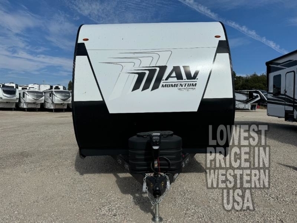 The Momentum MAV toy hauler travel trailers by Grand Design are designed to provide exactly what you need. The spacious garage provides tons of cargo space, with no wheel wells to get in the way. Additional storage includes magnetic storage door catches, underbed storage with a gas strut lift, and overhead consoles throughout. Conveniences like motion sensor lights and USB outlets will make your life easier, and you will be comfortable in all seasons with the 30K BTU furnace plus 15K BTU ducted air conditioning. The standard Solar Package comes with a 180W solar panel, a 40 Amp charge controller with Bluetooth, and a 12V refrigerator so you can go off-grid when the adventure calls for it.