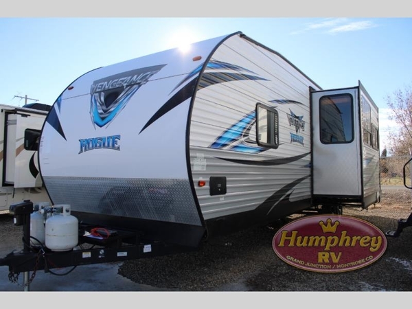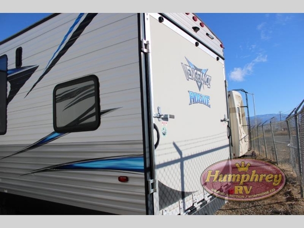 For any outdoor adventure you will want a Vengeance Rogue toy hauler travel trailer! These models feature an 8 cu. ft. refrigerator, a ramp door which allows easy loading and unloading, AM/FM stereo with indoor/outdoor speakers and a DVD player. With the enclosed underbelly you can now camp in all types of weather. After a day of playing outdoors then come back to your trailer and easily clean up at the outside shower.