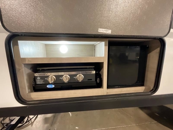 The dual entry doors make it easy to enter and exit this travel trailer! You will find a walk-around queen-size bed up front in the private bedroom, and one of the entry/exit doors to the unit so you can quietly slip out for an early morning fishing trip. The U-shaped dinette is right next to the window, so you can look out at your surroundings while you enjoy breakfast. The double-size bunks have some privacy curtains, and the bunks are right next to the full bathroom for easy access in the middle of the night. The fully equipped kitchen has everything you need to get dinner in the oven, and you can have some more prep space by using the flip-up countertop extension. You even have an outdoor griddle and an outdoor 1.6 cu. ft. refrigerator to enjoy a cold beverage while you cook under the 22' electric awning!