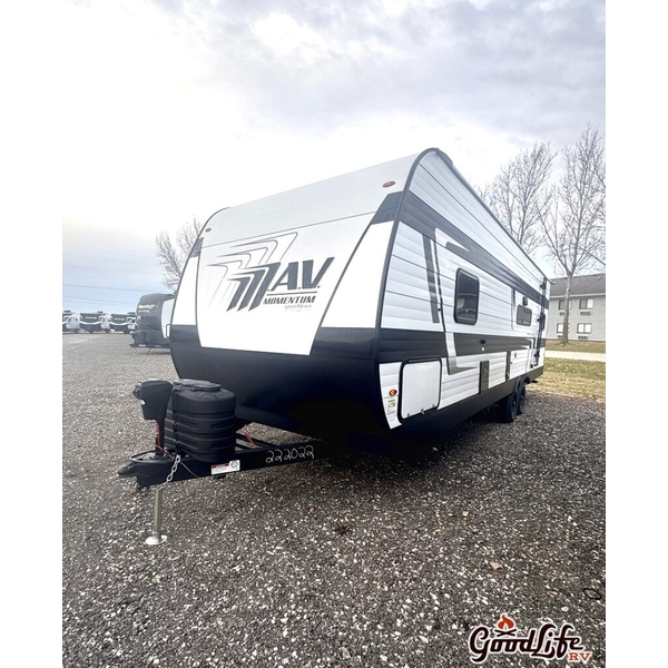 The 2025 Grand Design Momentum 27MAV is a lightweight, luxury toy hauler travel trailer designed for adventure enthusiasts. It combines robust cargo capacity with residential-style comfort, featuring a spacious garage for toys like ATVs or motorcycles, versatile sleeping arrangements, a modern kitchen, and a well-appointed bathroom. Built with Grand Design's quality construction, it offers durable materials, all-weather insulation, and advanced technology like solar prep and an efficient power management system, making it ideal for off-grid camping. The 27MAV delivers both functionality and style in a compact, maneuverable package.