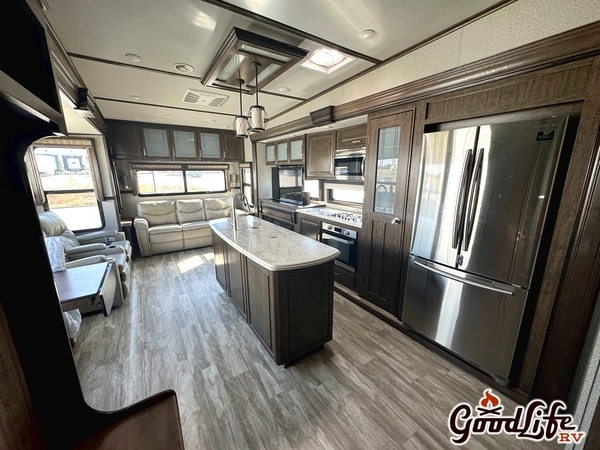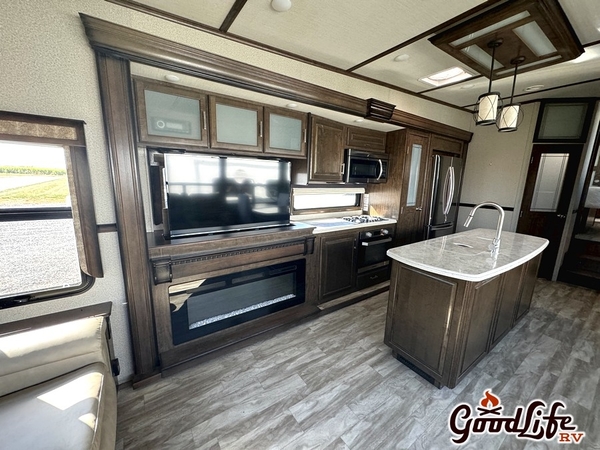 USED 2020 Solitude 373FB-R is a luxury fifth-wheel RV designed for extended stays and maximum comfort. It features a spacious front bathroom with double sinks, a large walk-in shower, and a walk-in closet. The rear living area includes a tri-fold sofa, theater seating, and an entertainment center with a fireplace. The kitchen boasts an island, residential-style appliances, and a pantry, while the half bath adds extra convenience. With high-end finishes, abundant storage, and a GVWR of around 16,800 lbs, this fifth wheel is perfect for those seeking a premium travel experience. You can find this