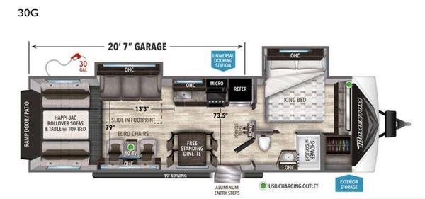 The 11-foot garage with a built-in ramp and 3,000 lb. cargo capacity easily hauls your ATVs or motorcycles. Once unloaded, it transforms into a living space with fold-down sofas, a power bunk, and a half bath for convenience.