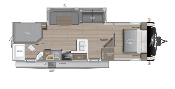 You never have to worry about running out of hot water in the Jay Feather, with the 60,000 BTU on-demand tankless water heater. The 55-gallon freshwater tank and heating element can warm up incoming water from the ground that is on average 55 degrees F.