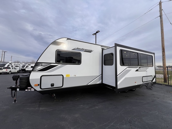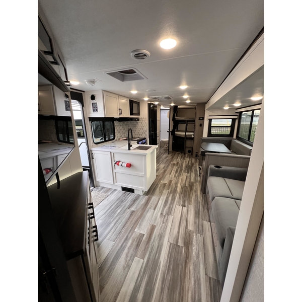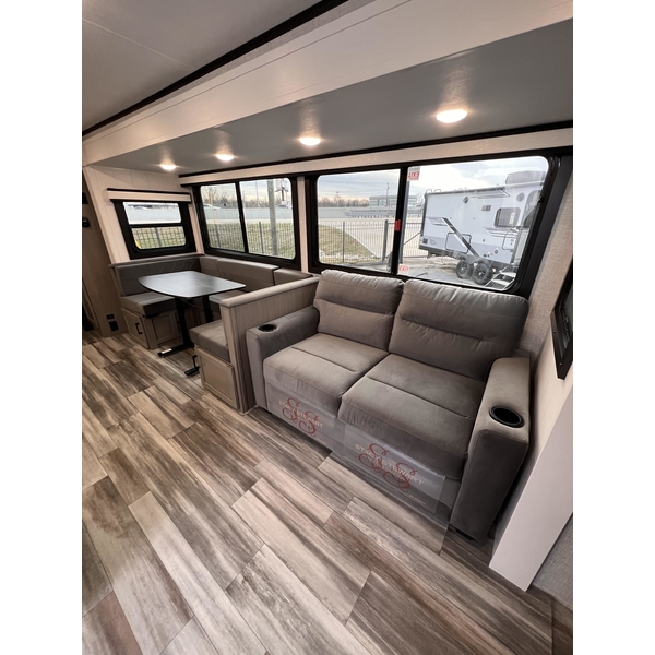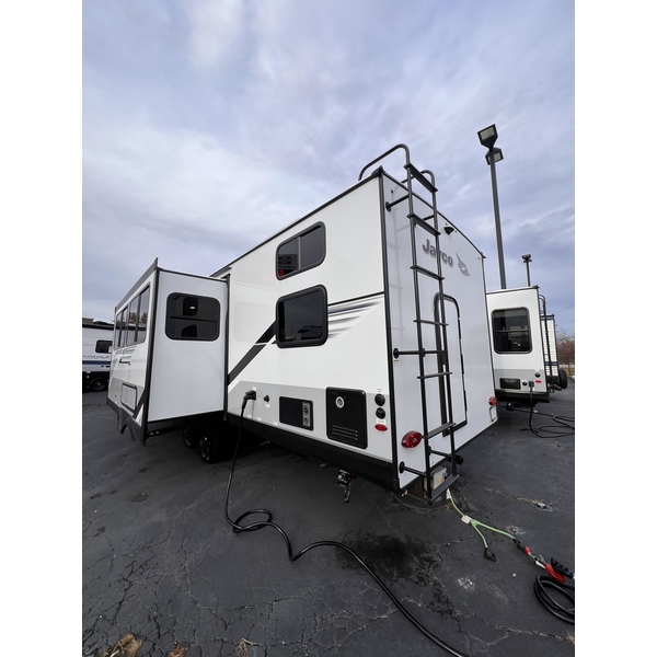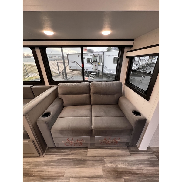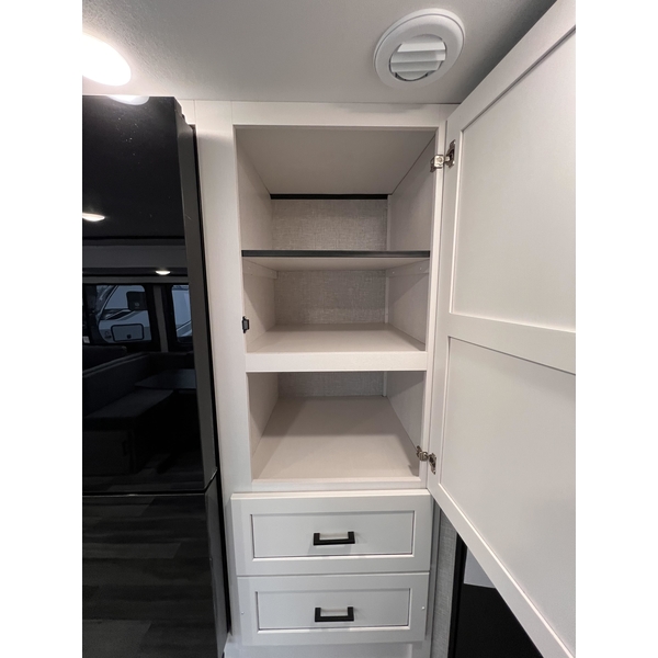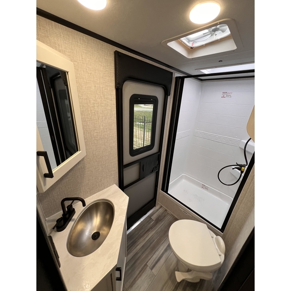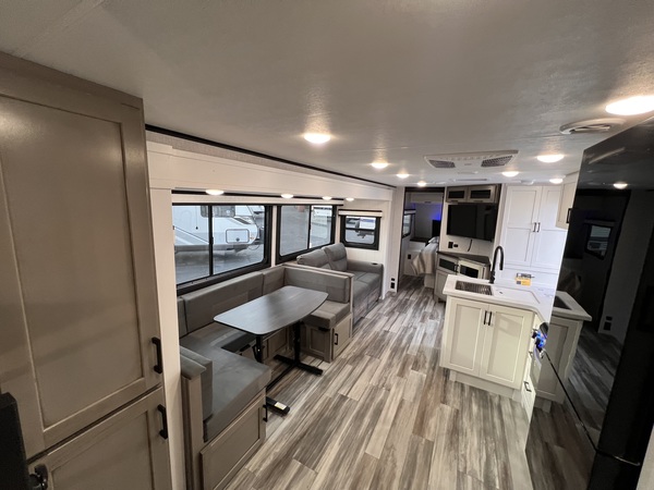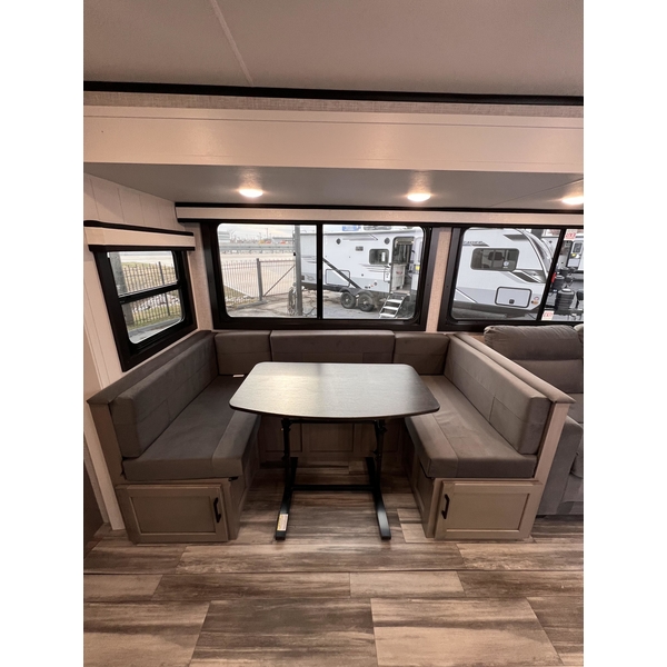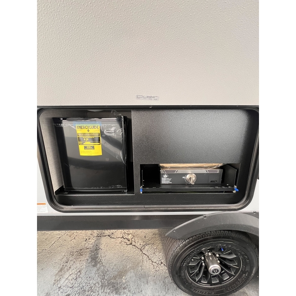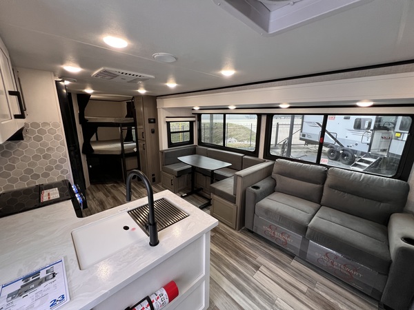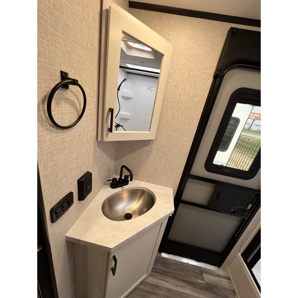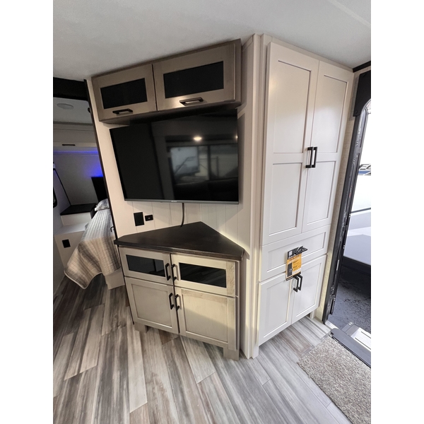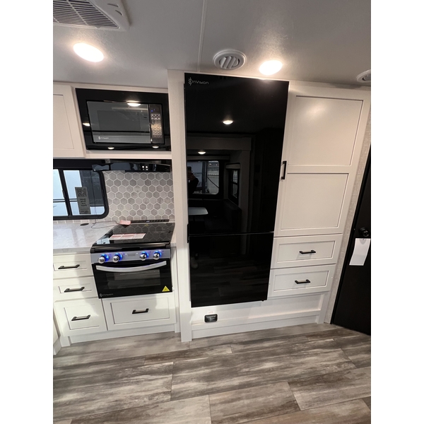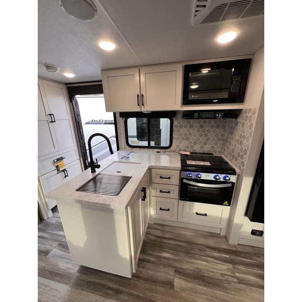 The amenities for 2025 dont stop there! In the kitchen area, you'll find seamless countertops throughout, a stainless-steel sink with a high-rise faucet and pull-out sprayer. You'll also be blown away by the all-new InVision Suite appliance package with an 11 cubic foot 12V fridge, standard in all Jay Feather models. This fridge has a shiny, black glass front with a two-door fridge over the freezer. Store more on the go with oversized cabinet doors and drawers. The cabinet doors are attached with hidden hinges to give each Jay Feather that sought-after residential look and feel.