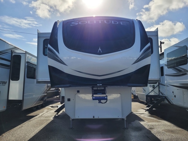 Each Solitude fifth wheel by Grand Design features a 101" wide-body construction, heavy duty 8,000 lb. axles, frameless tinted windows, and high-gloss gel coat sidewalls. You can camp year around thanks to the Weather-Tek Package that includes a 35K BTU high-capacity furnace, an all-in-one enclosed and heated utility center, and a fully enclosed underbelly with heated tanks and storage. Inside, you'll love the premium roller shades, hardwood cabinet doors, solid surface countertops, plus residential finishes throughout to make you truly feel at home. Each model also includes a MORryde CRE3000 suspension system, self adjusting brakes, and a MORryde pin box that will provide smooth towing from home to campground. Affordable luxury is possible with the Solitude fifth wheels; choose yours today!