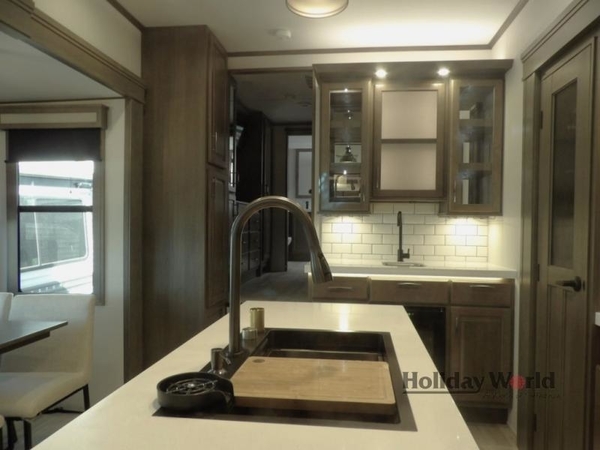 If you enjoy entertaining while camping, you will love this setup with a wet bar including a beverage cooler, a kitchen island to set snacks on, and a hutch for storing dishes. And, the gourmet kitchen appliances with a built-in oven along with a 20 cu. ft. refrigerator allow you to cook any meal for your family and friends. The separate front living room is spacious with dual opposing tri-fold sofa slides and theater seating, and a front wall with an LED telescoping TV and fireplace below plus storage for entertaining. You will have your own master bedroom with a queen bed slide, wardrobes, plus sliding doors that lead into the private master bath. Here you will find dual sinks, a shower with a seat, plus washer/dryer prep which is great for when you plan to stay awhile.