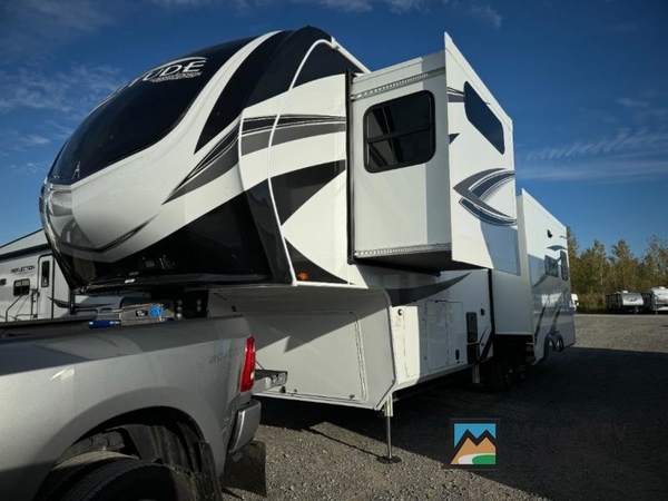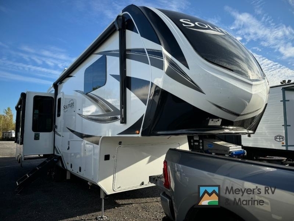 Each Solitude fifth wheel by Grand Design features a 101" wide-body construction, heavy duty 8,000 lb. axles, frameless tinted windows, and high-gloss gel coat sidewalls. You can camp year around thanks to the Weather-Tek Package that includes a 35K BTU high-capacity furnace, an all-in-one enclosed and heated utility center, and a fully enclosed underbelly with heated tanks and storage. Inside, you'll love the premium roller shades, hardwood cabinet doors, solid surface countertops, plus residential finishes throughout to make you truly feel at home. Each model also includes a MORryde CRE3000 suspension system, self adjusting brakes, and a MORryde pin box that will provide smooth towing from home to campground. Affordable luxury is possible with the Solitude fifth wheels; choose yours today!