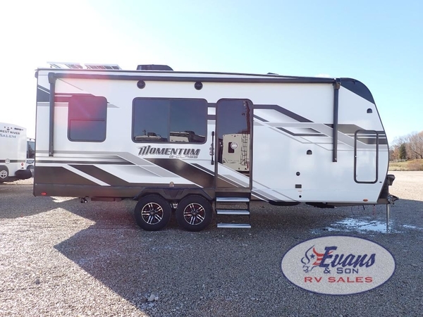 Are you looking for adventure and fun? The Momentum G-Class toy hauler by Grand Design will help you find it! You can explore during any season you choose with the Insulation Package that includes a heated and enclosed underbelly with suspended tanks, a high-capacity furnace, a moisture barrier floor enclosure, and cabinet-mounted heat ducts. Each model includes a fuel station with an interior and exterior gauge, a dovetail rear rend, and 2,500-LB tie-downs anchored into the chassis. Throughout the Momentum G-Class interior, you'll enjoy many comfortable features like large panoramic windows, a shower skylight, USB chargers in the bedroom, and residential cabinetry.