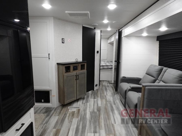 You'll be seeing double with this travel trailer that features dual entry doors and dual slides! The chef of your group will love cooking in the front kitchen with generous counter space, and there is a three burner cooktop with a glass cover, a microwave oven, and an 11 cu. ft. 12V refrigerator. Your crew can dine at the booth dinette or relax on the Jack-knife sofa. A dual entry bath will be easily accessible, and you'll love having your own space in the rear master bedroom. Here, you'll find a bed slide out, two dressers, additional storage, plus washer and dryer prep!