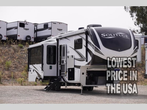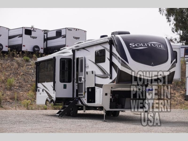 Each Solitude fifth wheel by Grand Design features a 101" wide-body construction, heavy duty 8,000 lb. axles, frameless tinted windows, and high-gloss gel coat sidewalls. You can camp year around thanks to the Weather-Tek Package that includes a 35K BTU high-capacity furnace, an all-in-one enclosed and heated utility center, and a fully enclosed underbelly with heated tanks and storage. Inside, you'll love the premium roller shades, hardwood cabinet doors, solid surface countertops, plus residential finishes throughout to make you truly feel at home. Each model also includes a MORryde CRE3000 suspension system, self adjusting brakes, and a MORryde pin box that will provide smooth towing from home to campground. Affordable luxury is possible with the Solitude fifth wheels; choose yours today!
