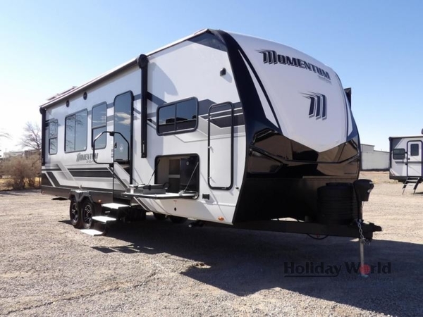 Are you looking for adventure and fun? The Momentum G-Class toy hauler by Grand Design will help you find it! You can explore during any season you choose with the Insulation Package that includes a heated and enclosed underbelly with suspended tanks, a high-capacity furnace, a moisture barrier floor enclosure, and cabinet-mounted heat ducts. Each model includes a fuel station with an interior and exterior gauge, a dovetail rear rend, and 2,500-LB tie-downs anchored into the chassis. Throughout the Momentum G-Class interior, you'll enjoy many comfortable features like large panoramic windows, a shower skylight, USB chargers in the bedroom, and residential cabinetry.