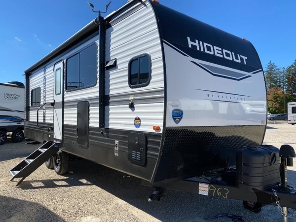 The Keystone Hideout travel trailers will be just what the doctor ordered for a stress-free holiday at your favorite campsite! There are a few exclusive features that you'll only find on a Keystone product, like the in-floor heating ducts and the Tru-fit slide construction. Each model has a power awning for some shade in the afternoon, and the tinted safety glass windows will prevent the harmful UV rays from getting inside. You'll also have blackout night shades that you can close when you want privacy and one-piece pressed countertops that are not only sleek looking, but easy to keep clean.