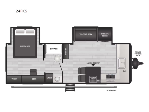 Will you choose to take this travel trailer to the lake or woods? Wherever you choose, you will be met with many comforts. The rear private bedroom includes a queen bed slide out for more floor space plus a desk with a chair if you need to get some work done. A walk-through bath will be easily accessible, and there is a spacious linen closet to keep towels clean. Head to main living room to relax on the tri-fold sofa or make dinner in the front kitchen. The counter with two chairs provides a place to eat breakfast each morning, and the lower pantry will be perfect for extra snacks. This model also includes an outdoor kitchen under the 18' power awning; how convenient!