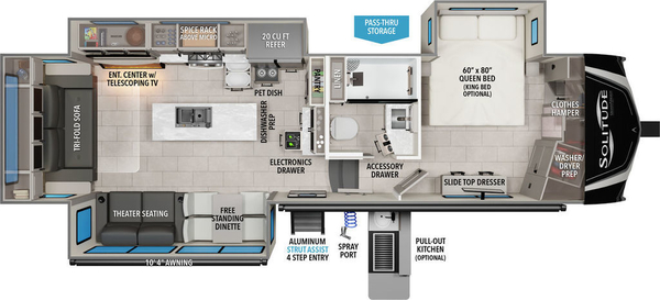 If you're looking for more room, Solitude is the most spacious Extended Stay Fifth Wheel ever built. Taller ceilings, bigger cabinets, and a sweeping scenic window all make the Solitude a dream that you wake up to as long as you like.
