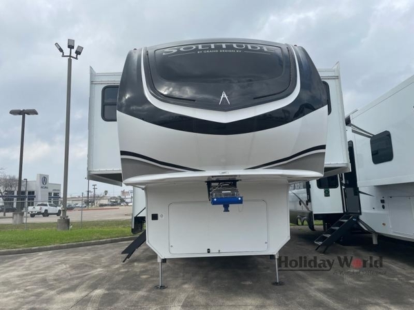 Each Solitude fifth wheel by Grand Design features a 101" wide-body construction, heavy duty 8,000 lb. axles, frameless tinted windows, and high-gloss gel coat sidewalls. You can camp year around thanks to the Weather-Tek Package that includes a 35K BTU high-capacity furnace, an all-in-one enclosed and heated utility center, and a fully enclosed underbelly with heated tanks and storage. Inside, you'll love the premium roller shades, hardwood cabinet doors, solid surface countertops, plus residential finishes throughout to make you truly feel at home. Each model also includes a MORryde CRE3000 suspension system, self adjusting brakes, and a MORryde pin box that will provide smooth towing from home to campground. Affordable luxury is possible with the Solitude fifth wheels; choose yours today!