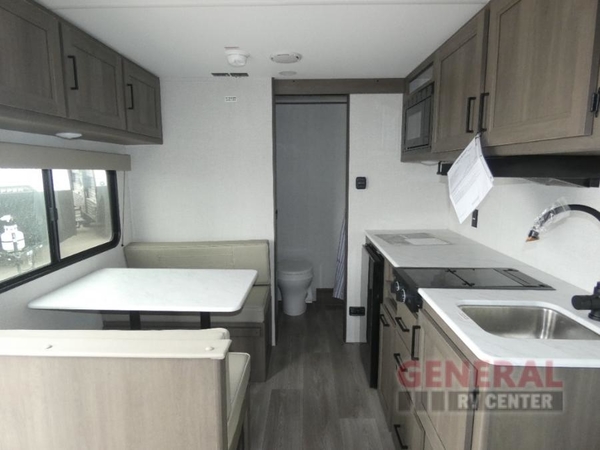 This is the perfect couple's trailer with versatile seating and sleeping space! You'll find a queen-size Murphy bed up front with storage space beside and above plus a full rear bath for added privacy. Once you've made lunch in the full kitchen, you can dine at the booth dinette, or take your plate outdoors to sit under the 10' power awning. You'll also find an unobstructed pass-thru storage outside that will be perfect for fishing poles, lawn chairs, tools and more!