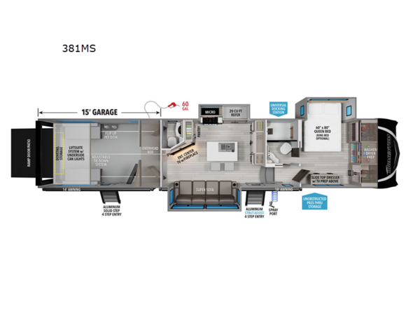 Traveling with friends and family can be comfortable when you have a full double entry bathroom and a half bath available when camping and enjoying the trails on your off-road toys! You will have an 15' garage space that can become a second living/dining area as well as a bedroom if you add the optional Liftsuite System. There is an overhead loft bed and a four-seat sofa slide for more sleeping space in the main living area. Everyone can watch the LED TV when waiting for dinner, and enjoy the fireplace on those chiller nights. The kitchen island offers a sink to wash dishes, extra counter space for serving meals and two stools to dine at. The cook will love all the upgraded appliances and the space thanks to the slide. The front bedroom gives you a queen bed slide with a king bed option, lots of clothing space, and a slide top dresser for even more storage.