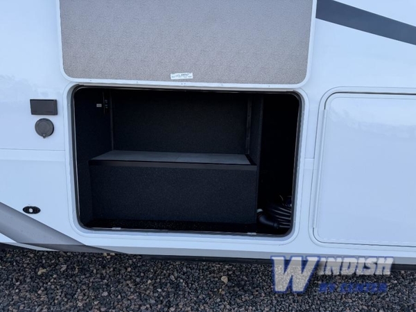 The whole gang will love camping in this spacious fifth wheel for five to six! You'll have your own bedroom up front with a queen bed slide out, a large front closet with a hamper and washer and dryer prep, plus a private entry door into the dual entry bath. Your guest can take the middle bedroom that includes a tri-fold sofa with a bunk above, a dresser/desk, plus a 50" TV for entertainment. A full kitchen includes an L-shaped counter, a 20 cu. ft. refrigerator, pull-out trash cans plus many more convenient features. And don't overlook the rear living area with its L-shaped sofa, theater seating, and free-standing dinette. There is also an entertainment center with a telescoping TV and a fireplace plus an electronics drawer to charge your phone or laptop.