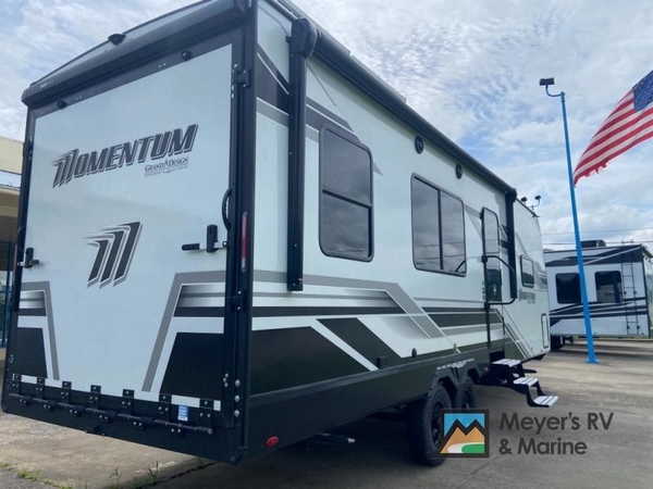 Are you looking for adventure and fun? The Momentum G-Class toy hauler by Grand Design will help you find it! You can explore during any season you choose with the Insulation Package that includes a heated and enclosed underbelly with suspended tanks, a high-capacity furnace, a moisture barrier floor enclosure, and cabinet-mounted heat ducts. Each model includes a fuel station with an interior and exterior gauge, a dovetail rear rend, and 2,500-LB tie-downs anchored into the chassis. Throughout the Momentum G-Class interior, you'll enjoy many comfortable features like large panoramic windows, a shower skylight, USB chargers in the bedroom, and residential cabinetry.