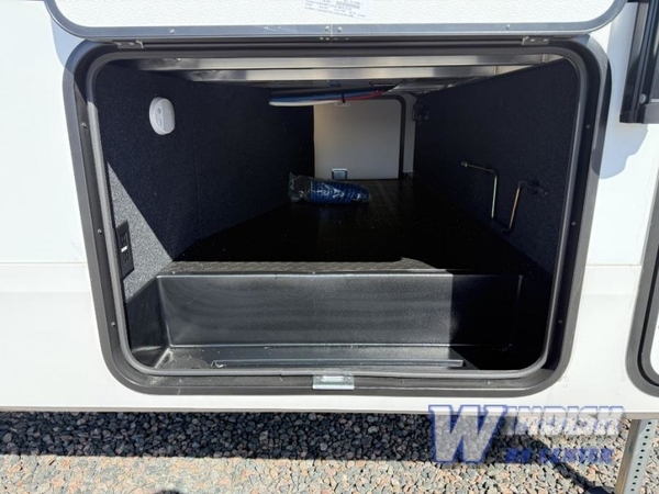 This is the perfect couple's trailer with a space for an overnight guest or two little ones on the booth dinette. You can switch out this dinette for an optional swivel dinette as well, and the standard theater seating can be replaced by an optional trundle bed if you need more sleeping space. A 40" HDTV will keep you entertained when the weather isn't cooperating, and you can whip up your best meals in the full kitchen. And a 19' power awning will provide shade if you choose to take your plate outdoors! The spacious full bath will let you clean up each day, and you'll feel right at home in the front private bedroom with a queen bed!