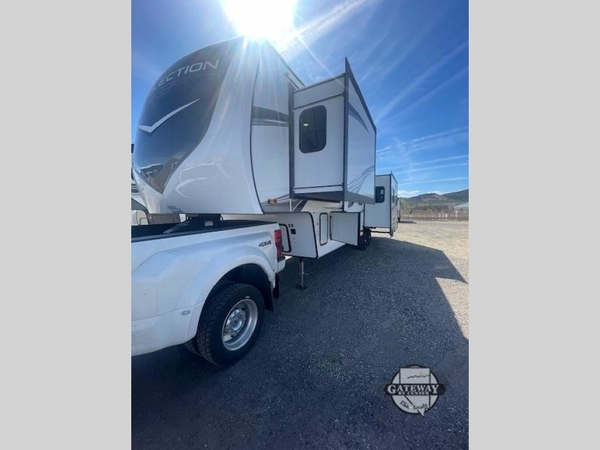 With any Reflection fifth wheel by Grand Design, you will have a solar panel for off-grid camping and a 60 amp charge controller and inverter prep, a Universal All-In-One docking station, unobstructed pass-through storage, and Goodyear Endurance tires. Each is constructed of gel coat exterior sidewalls, residential 5" truss rafters, walk-on roof decking, a fiberglass and radiant foil roof and front cap insulation plus laminated aluminum framed side walls, roof and end walls in slide rooms. Head inside to enjoy residential hardwood cabinet doors, premium Congoleum flooring, a spacious shower with a glass door, and many more comforts!