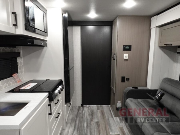 This cozy travel trailer is the perfect couple's trailer with space for an overnight guest on the jack-knife sofa with swivel tables. You'll sleep soundly each night on the front 60" x 75" queen bed, and there are dual wardrobes and nightstands to keep your space tidy. Whip up some eggs on the three burner cooktop, or use the microwave oven for instant oatmeal, plus there is an outside griddle for the JayPort system so you can make breakfast outside. You will also find plenty of storage space throughout, including a large kitchen pantry, overhead cabinets, and exterior storage!