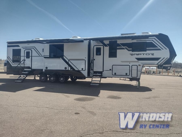 Experience a breath of fresh air with one of these Keystone RV Raptor fifth wheel toy haulers! Their rugged construction consists of a one-piece Alpha Super Flex TPO roof membrane, Dyna Span floor decking, and 5,000 lb. frame-welded tie- downs to keep your toys in place as you travel. Some unexpected conveniences you will appreciate include an Omni-Chill A/C system to keep you cool on those hot summer days, a Furrion backup camera, MaxTurn technology with a Helux pin box, and a Generation 3 iN-Command smart automation system with Global Connect to make life easier. There is also designer style vinyl flooring throughout, along with hardwood ceiling treatment with LED accent lighting, beach wood and white cabinetry, and many more interior comforts!